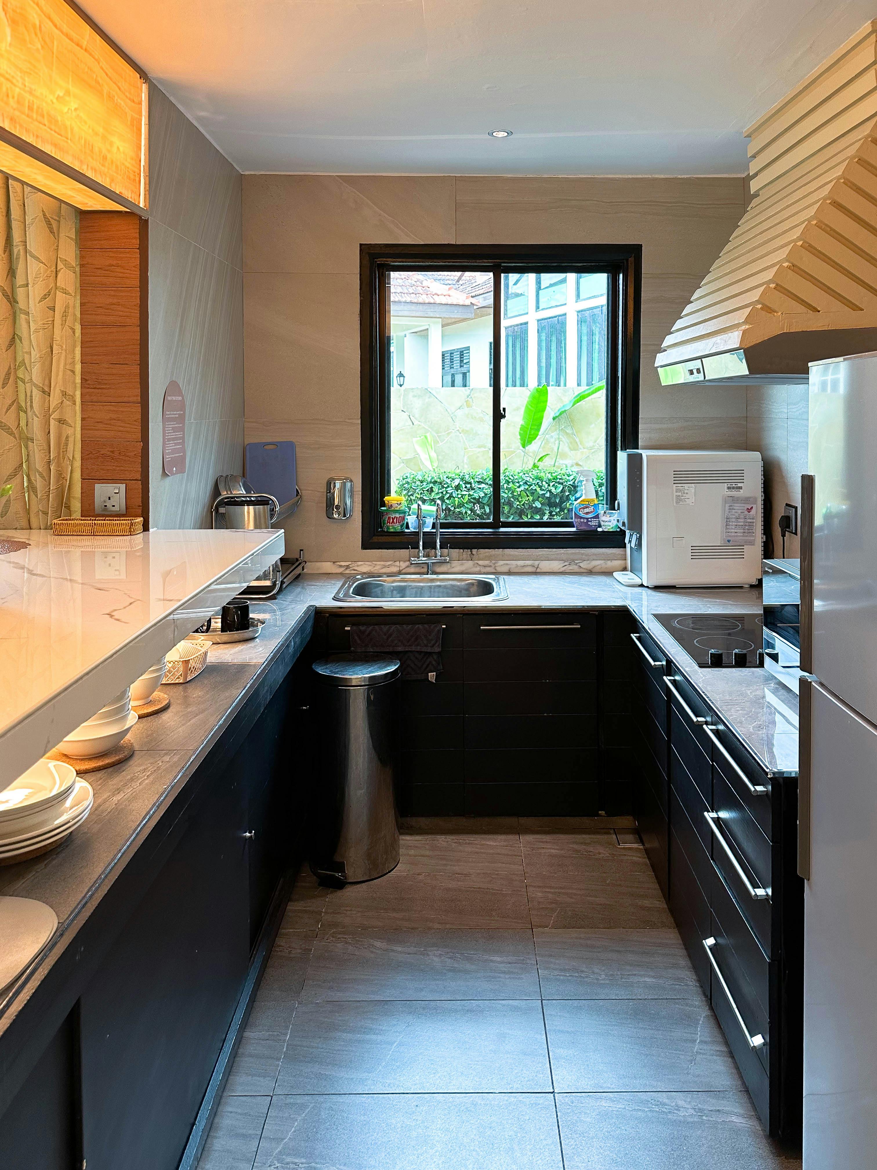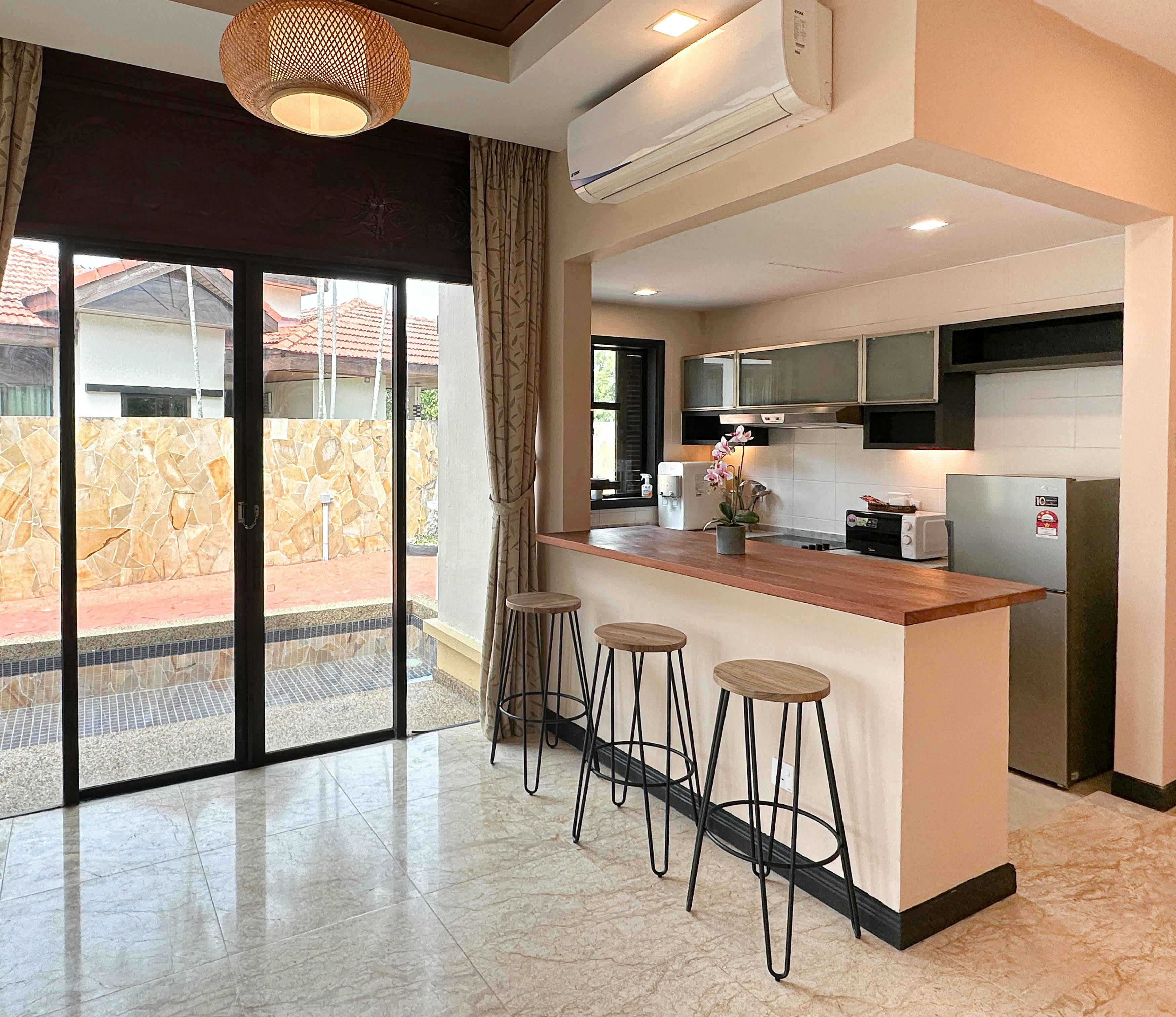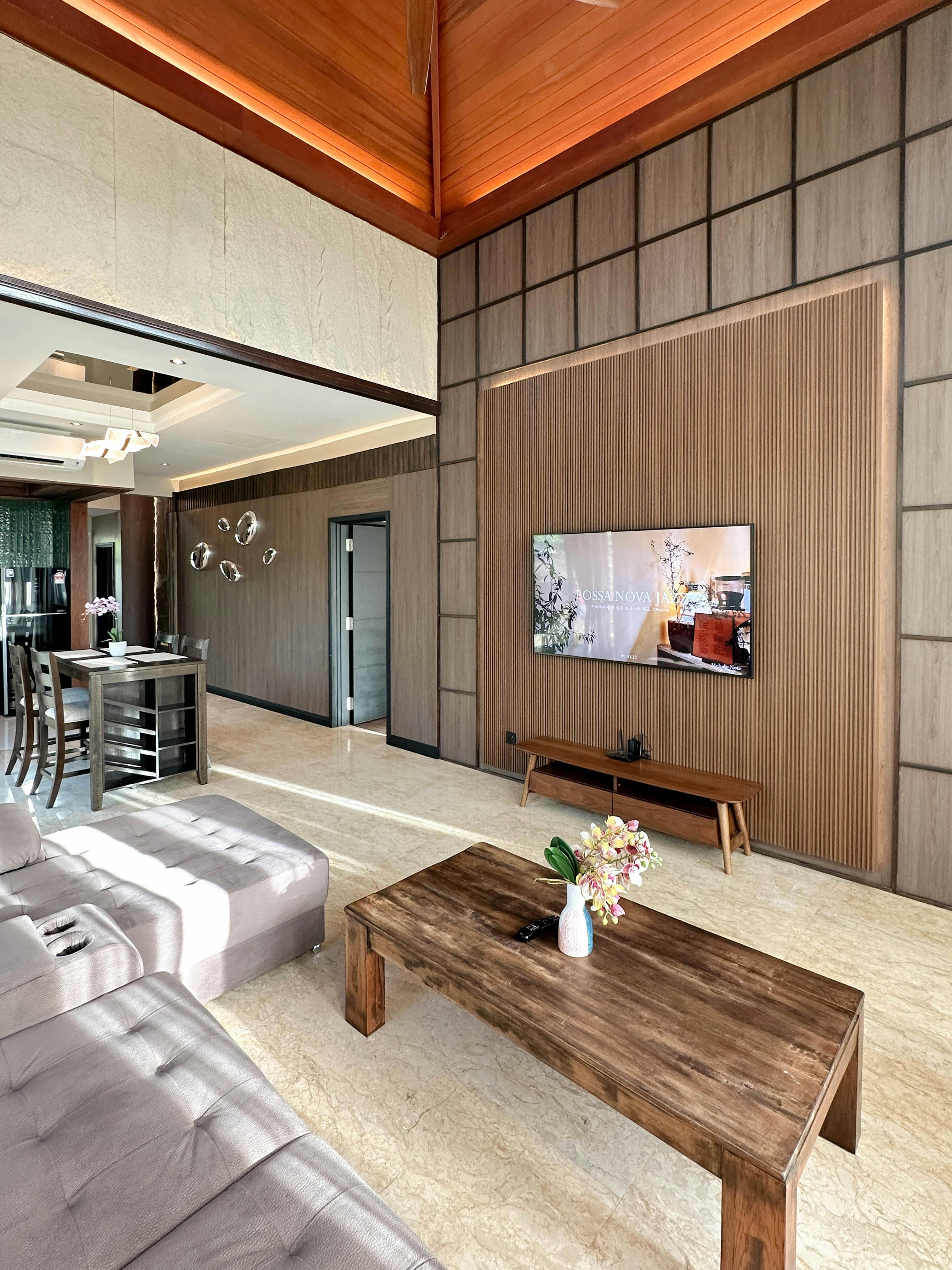 Offering panoramic views of the hill and oceans, the garden-view villa features spacious accommodation with a private swimming pool and a fully equipped kitchen. Free Wi-Fi and parking are provided. Fully furnished, the elegant villa comes with modern interiors and a double-height ceiling living room. The villa includes two spacious bedrooms, an ensuite bathroom with a Jacuzzi and private patios. Two 55-inch TVs, a wine cooler, and a water purifier are provided. The dining area, kitchen and villa all overlook the garden.